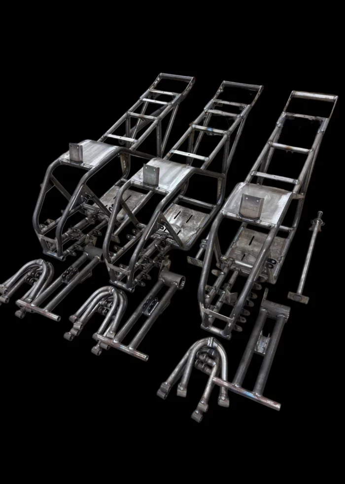 Frame, control arms, rear swing arm, brake rotor, 48t sprocket, axle, wheel hubs, sprocket hub, brake rotor hub, steering tie rods, bearings, bushings and hardware.